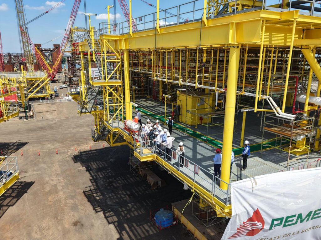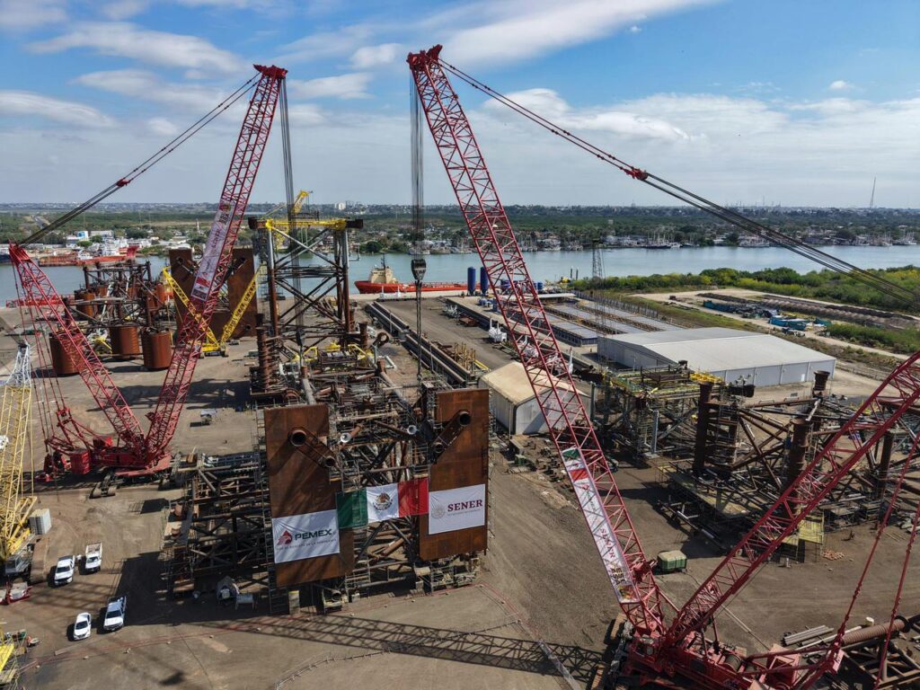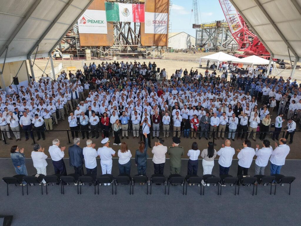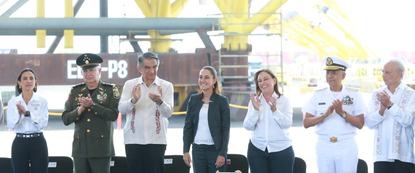 Durante el evento celebrado en el Patio Industrial de Pueblo Viejo, Veracruz, y junto a la gobernadora anfitriona Rocío Nahle García, al pie de las nuevas plataformas petroleras marinas construidas por Petróleos Mexicanos, la presidenta Claudia Sheinbaum destacó la presencia de Américo Villarreal, a quien consideró “un hombre nacionalista y visionario”.