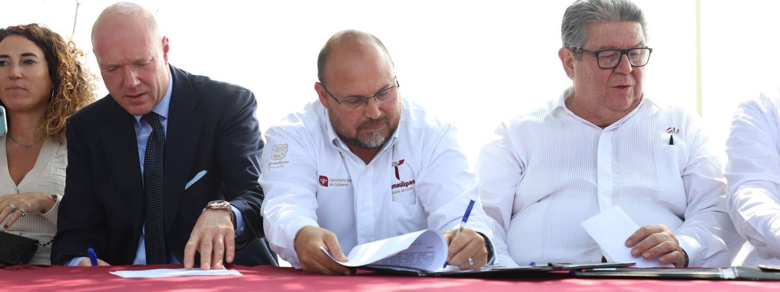 Altamira, Tamaulipas. – En cumplimiento con el compromiso del Gobierno del Estado con la Agenda 2030 de la ONU, en su eje de Agua Limpia y Saneamiento, el secretario general de Gobierno, Héctor Joel Villegas González, en representación del gobernador Américo Villarreal Anaya, participó como testigo de honor en la firma del acuerdo de colaboración para la construcción de la Planta de Tratamiento de Aguas Residuales en el sector de La Pedrera, Altamira. El evento contó también con la presencia del presidente municipal, Armando Martínez Manríquez, y empresarios de la compañía neerlandesa Dutch Clean Tech.