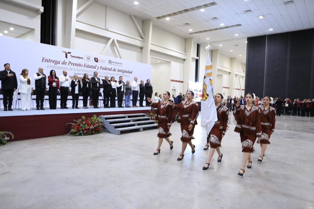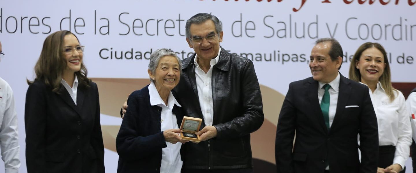 Acompañado por Marggid Rodríguez Avendaño, coordinador de IMSS-Bienestar en Tamaulipas y dirigentes sindicales, el jefe del Ejecutivo entregó 37 premios de antigüedad, de un total de 1,400 a personal de salud, destacando por 60 años de servicio, Almarcelia Cárdenas Guardado, enfermera general titulada “B”, del Distrito de Salud para el Bienestar I, en Ciudad Victoria.