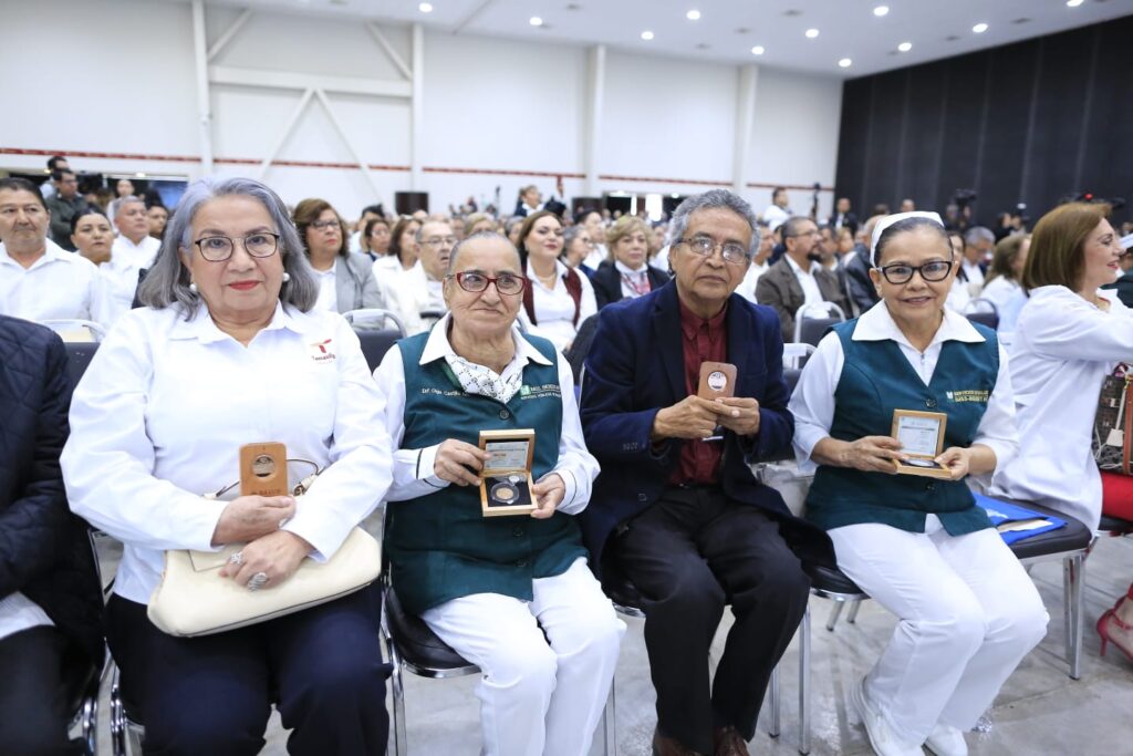 Por 55 años, se reconoció a Oscar Javier Álvarez Meléndez, médico especialista “C” del Hospital Civil de Victoria y a Alma Rosa Escobar Camacho, licenciada en Enfermería de la Oficina Central en Victoria, mientras que por 50 años recibieron su presea: Olga Castillo González, enfermera general titulada “A”; Distrito de Salud para el Bienestar VI en El Mante y Rubén Rodríguez Prado, jefe de sector en Programas de Salud en la Oficina Central de Victoria.