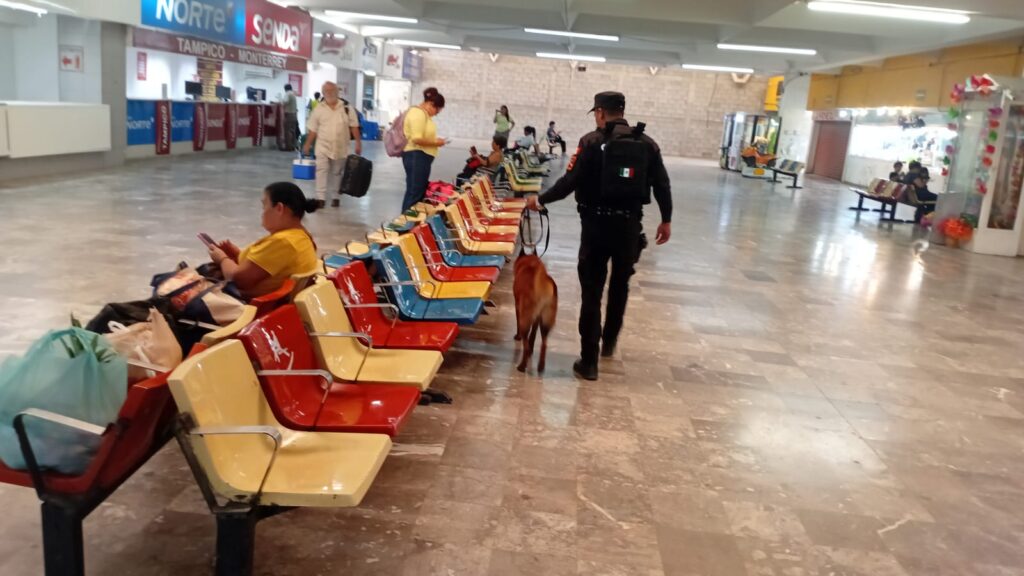 Ciudad Victoria, Tamaulipas.– Con el objetivo de reforzar la proximidad social y brindar mayor seguridad a las personas usuarias del transporte público, personal de la Guardia Estatal, a través del Agrupamiento Canino, realiza operativos de vigilancia en la Central de Autobuses de Ciudad Victoria.