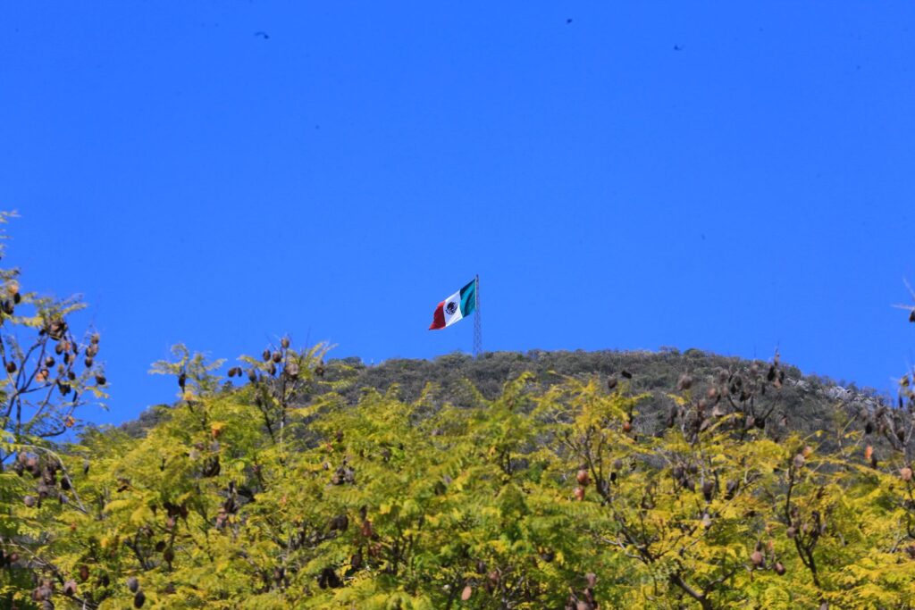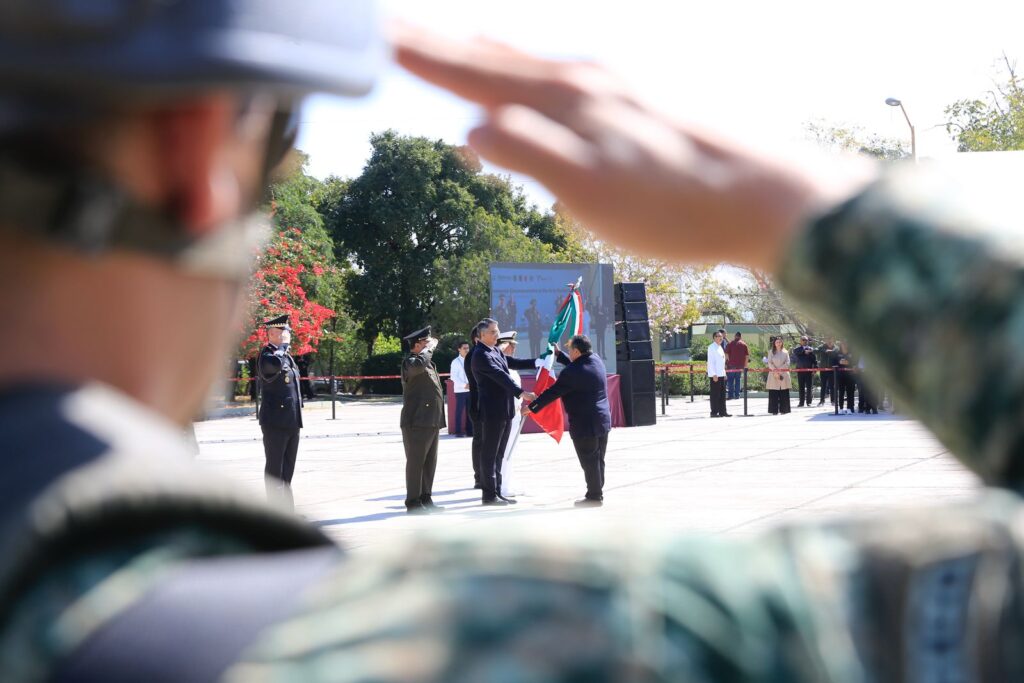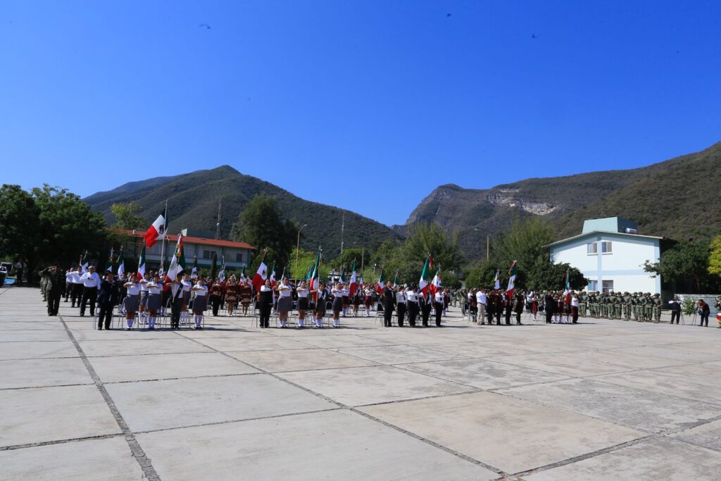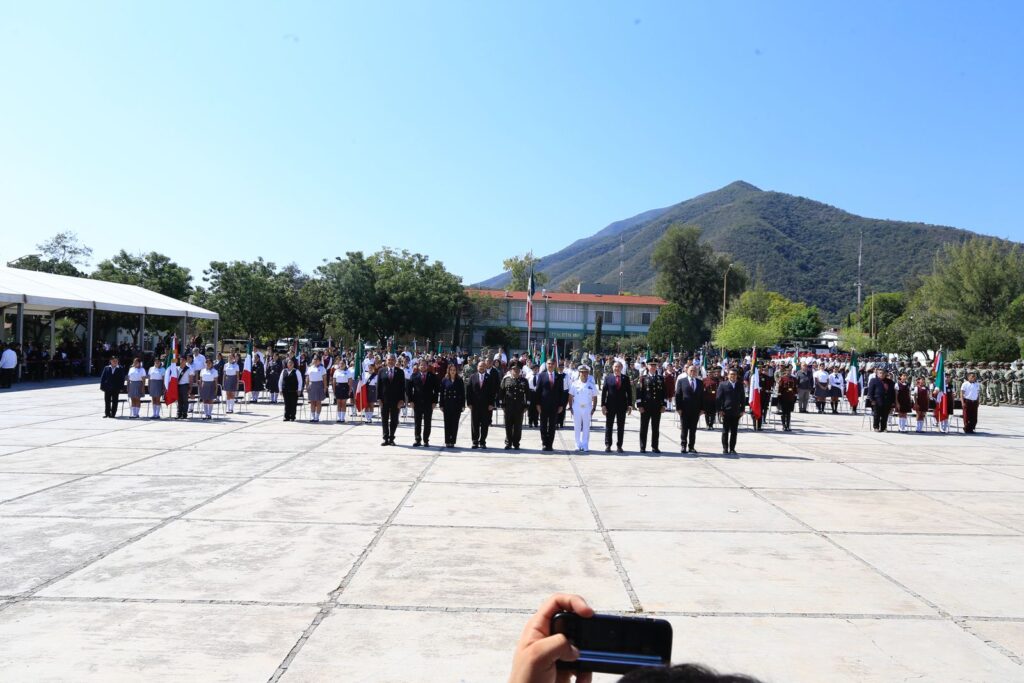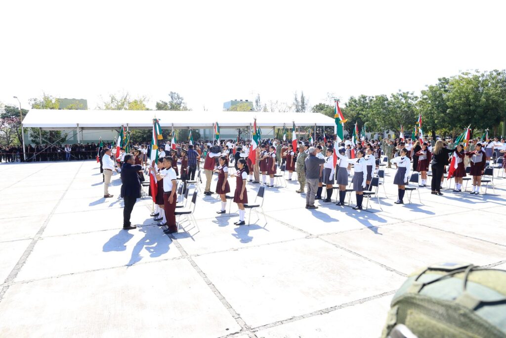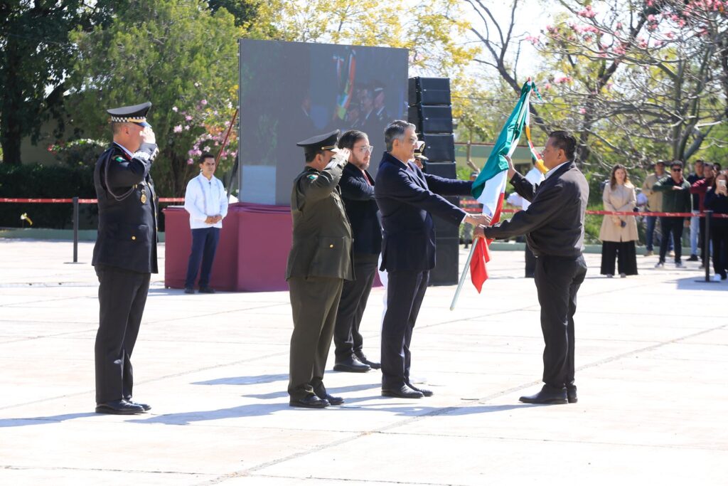 Durante el evento cívico, que incluyó un enlace con la ceremonia encabezada por la presidenta Claudia Sheinbaum Pardo, y en el cual también se izó la bandera del Cerro del Aura, el mandatario estatal, quien hizo entrega del lábaro patrio para su guarda y custodia a cinco escuelas, reafirmó el compromiso de las nuevas generaciones con los valores y símbolos patrios.