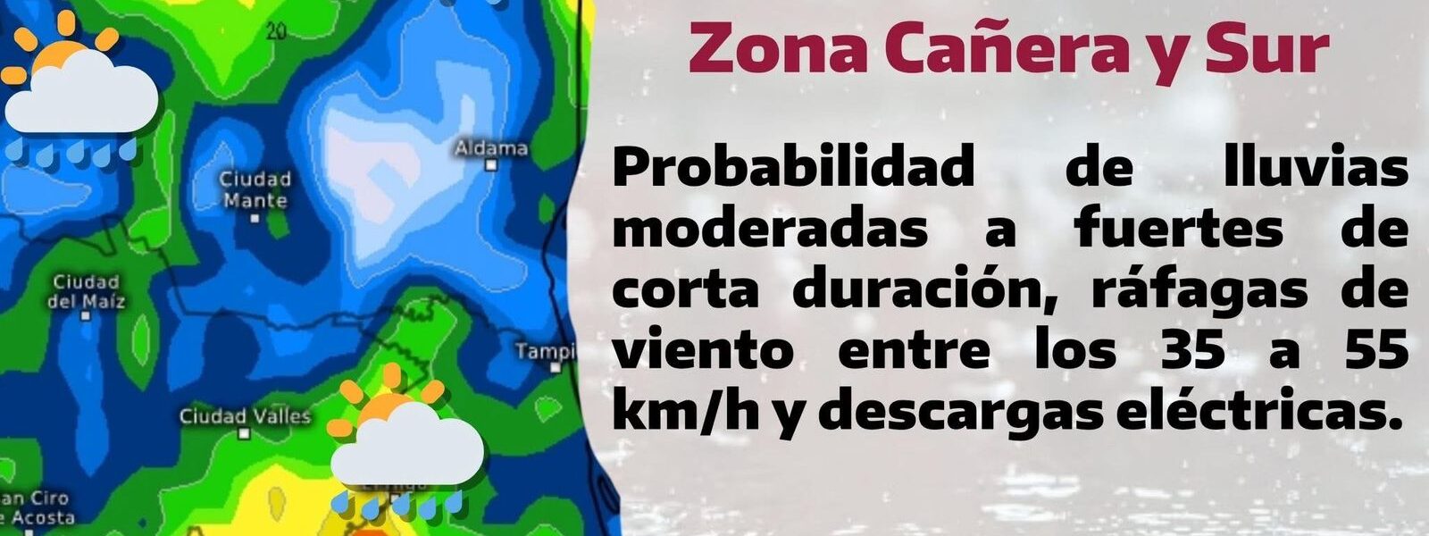 El sistema cruzará durante el mediodía y tarde del domingo, generando vientos de 40 a 60 km/h y chubascos dispersos con lluvias moderadas a fuertes de corta duración. Se estiman temperaturas mínimas de 15°C en la región cañera y 17°C en el sur del estado.