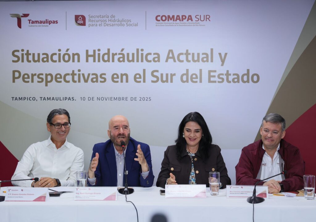 Tampico, Tamaulipas.– Con el objetivo de fortalecer la atención integral a la problemática de los socavones en la zona conurbada del sur de Tamaulipas, se llevó a cabo una reunión de coordinación encabezada por el secretario de Recursos Hidráulicos para el Desarrollo Social, Raúl Quiroga Álvarez, acompañado por el gerente general de Comapa Sur, Francisco González Casanova, y los alcaldes de Tampico, Mónica Villarreal, y de Ciudad Madero, Erasmo González Robledo, así como representantes de las fuerzas armadas y del sector industrial.