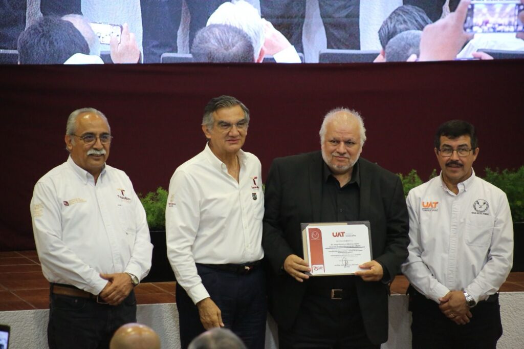 El gobernador entregó reconocimientos a los ponentes del foro: Armando García López, director de la Comisión México-Estados Unidos para la Prevención de la Fiebre Aftosa y otras Enfermedades Exóticas de los Animales (CPA) del SENASICA; Juan Diego Pérez de la Rosa, coordinador de la Dirección General de Salud Animal de SENASICA, y a Jorge Francisco Monroy López, epidemiólogo, investigador y académico de la FMVZ de la UNAM.