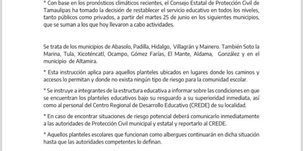 Junio 24 de 2024 Ciudad Victoria, Tamaulipas. • Con base en los pronósticos climáticos recientes, el Consejo Estatal de Protección Civil de Tamaulipas ha tomado la decisión de restablecer el servicio educativo en todos los niveles, tanto públicos como privados,…