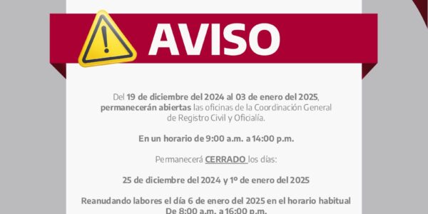 Diciembre 20 de 2024 Ciudad Victoria, Tamaulipas.- El coordinador del Registro Civil, Mauro Francisco Sandoval Contreras, informó que en cumplimiento con el compromiso de atención a la ciudadanía, la Coordinación de Registro Civil continuará brindando sus servicios durante el periodo…
